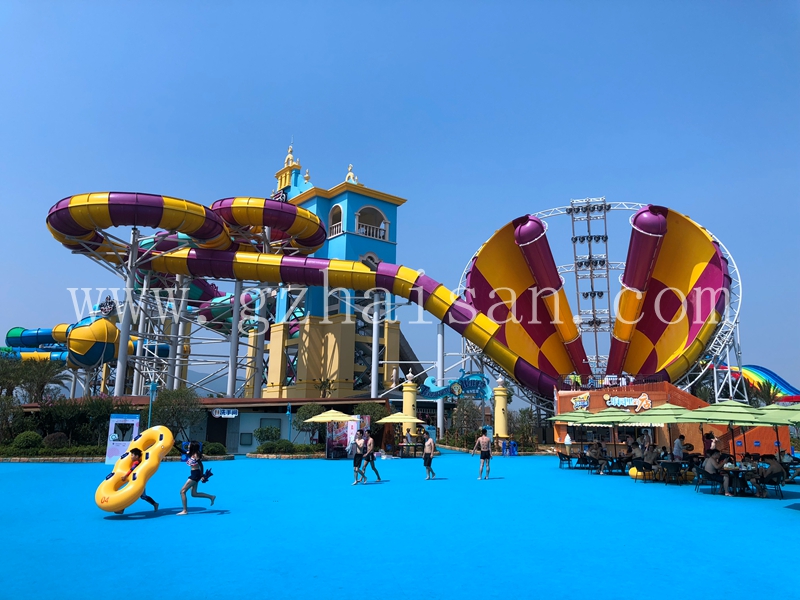 later stage of water park equipment installation and commissioning, the amusement